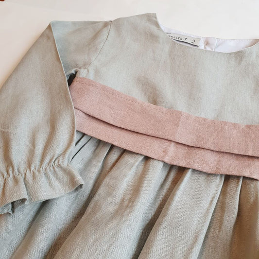 Vestido Lino Gris Lazo Palo Rosa Manga Larga
