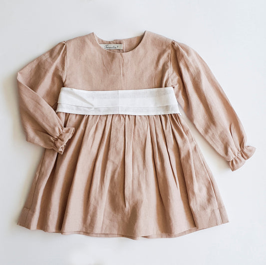 Vestido Lino Blanco Lazo Beige Manga larga