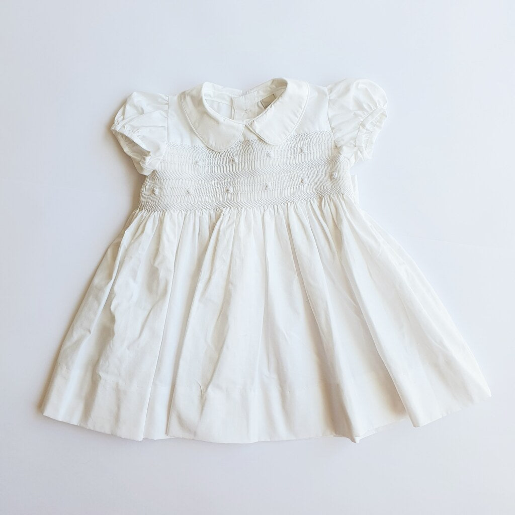 Este vestido de algodón blanco es el complemento perfecto para ceremonias religiosas y ocasiones especiales. Su bordado a mano en punto smock hace que sea una prenda única y exclusiva. Su diseño clásico y elegante es pensado idealmente para bautizos, primera comunión y ceremonias.